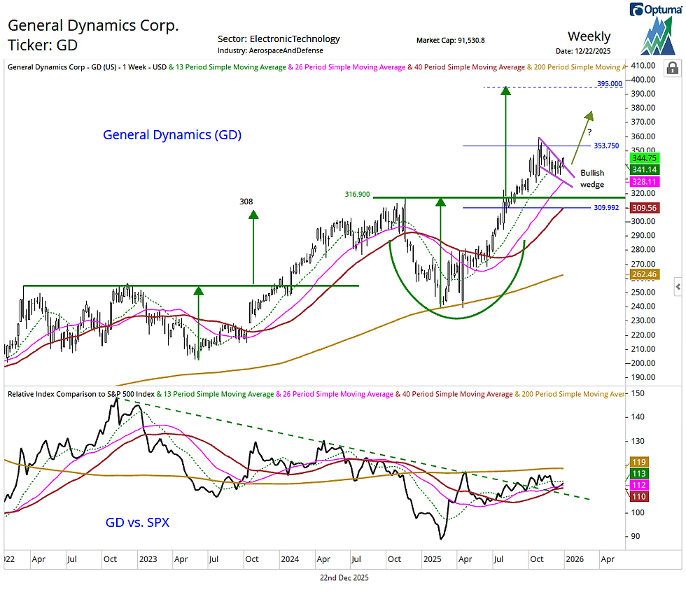 A late 2024 into mid 2025 bullish consolidation pattern favors further upside to 395 on General Dynamics (GD). After the stock rallied and tested its 100% extension of the mid 2023-late 2024 rally projected from the April 2025 low at 353.75 in late October, it formed a falling (aka bullish) wedge. Sustaining the breakout from this pattern would keep the overall trend positive as rising 13- and 26-week moving averages from 341 down to 328 support GD's bullish backdrop.