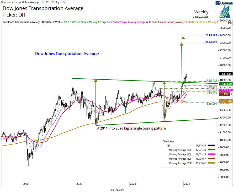 The recently completed 2011 into 2026 big base triangle pattern suggests longer-term upside potential to 23,000-23,900 on DJT. This bullish breakout remains firmly in place above 17,845-17,300. We highlighted this triangle pattern in Straight from the Chart on November 25, 2025.