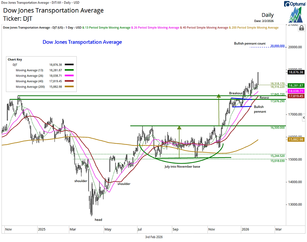 An upside breakout and retest, along with a completed bullish pennant, confirm the January push to all-time highs for the Dow Jones Transportation Average (DJT). The immediate pattern is bullish above yesterday’s (2/2) upside gap at 18,318-18,316 (18,300) with upside potential to the bullish pattern count at 20,000. If needed, the bullish breakout and retest zone offer additional and important support at 17,845-17,676. The bigger picture breakout from a 2011 into 2026 triangle big base pattern suggests longer-term upside potential into the 23,000s. We highlighted FedEx (FDX) as a bullish setup for 2026 within Transportation (Straight from the Chart blog – Jan 2).