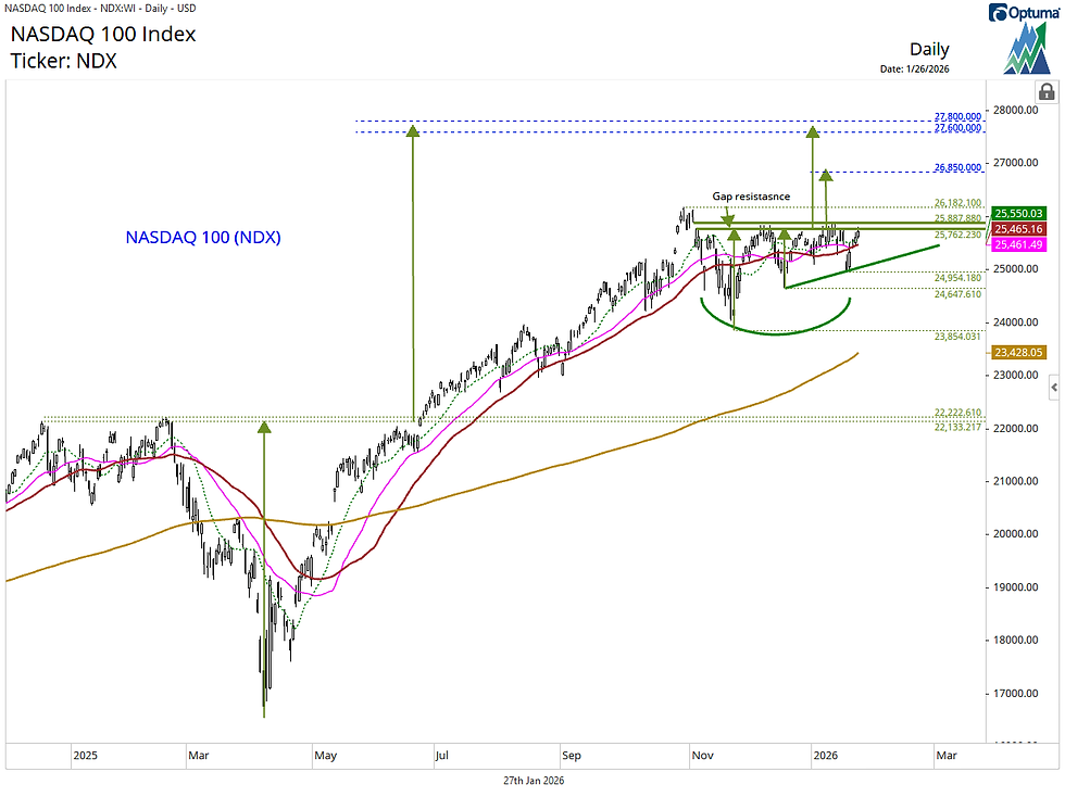 The Dow Theory using the broad-based NASDAQ and NYSE Composites is on a bull market signal from May 2025. New highs for both the NASDAQ and NYSE confirmed this “primary bull market” as of late October 2025. However, entering 2026, this version of Dow Theory is on an “unconfirmed bull market signal” with a push to new highs on the NASDAQ required to confirm it. The NASDAQ Composite has a similar technical setup to that of the NDX. If the NDX musters the strength to breakout from its bullish consolidation, the NASDAQ Composite likely follows.