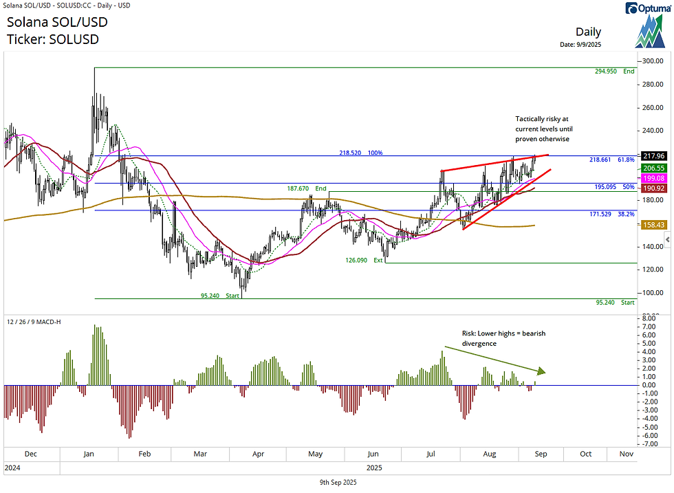 However, near-term risk lies at the 218.66 level, which marks the 61.8% retracement of the January–April 2025 decline and coincides almost exactly with an important 100% Fibonacci extension at 218.52. This zone also aligns with the upper boundary of a potential rising, or bearish, wedge pattern. Slowing price momentum based on the daily MACD histogram provides a bearish divergence as Solana tests this resistance.