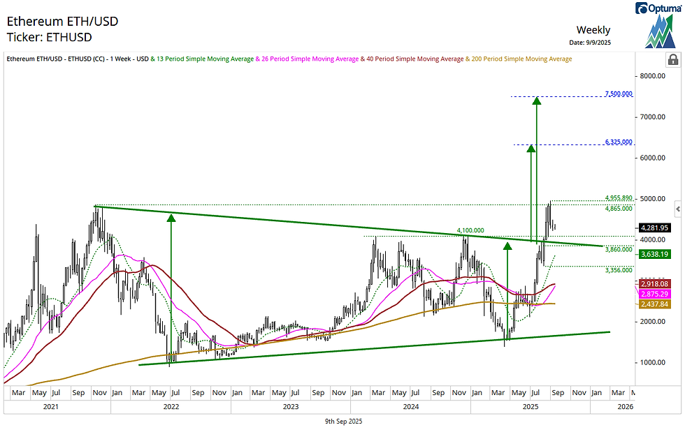 While above these breakout support levels, we have confidence in the big base, which sets up Ethereum for upside potential beyond the late 2021 August 2025 highs at 4865-4956 toward longer-term bullish counts at 6325 and 7500.