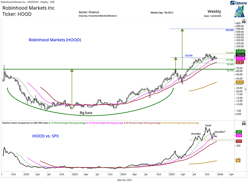 HOOD has since consolidated lower within its longer-term bullish trend. From a risk-management perspective, rising 26- and 40-week moving averages near 119 and 97 reinforce important chart support levels at 117.70 and 93.36, respectively, helping to define pullbacks within the broader uptrend. The late November dip to 102.10 held within this zone.