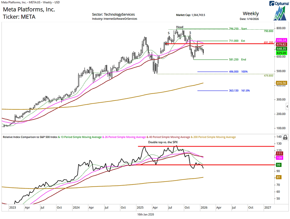 Our January 9, 2026, The Chart Check report highlighted a head and shoulders top and loss of leadership for the Magnificent Seven ETF (MAGS) relative to both the S&P 500 (SPY) and S&P 500 equal weight (RSP). META is breaking lower from a double top off its February and August 2025 highs relative to the S&P 500. This could confirm a loss of leadership for this mega cap growth stock.