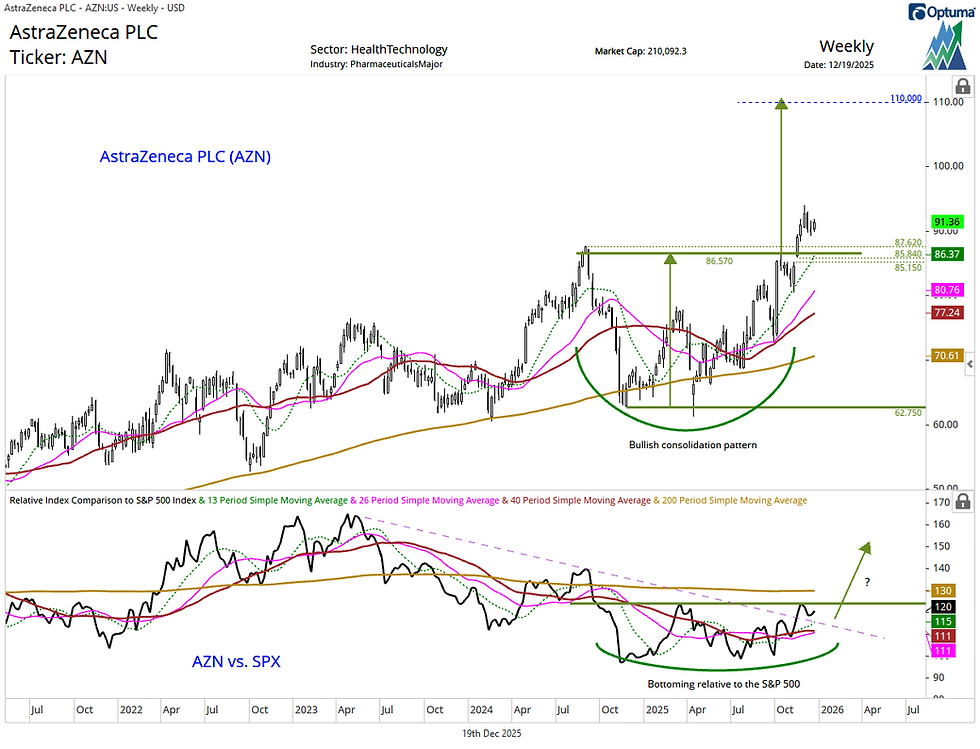 The bullish breakout for AstraZeneca (AZN) remains in place above 87.63-86.57 (breakout levels) and 85.84-85.15 (the mid November weekly upside gap) with upside potential to 110 (pattern count). The rising 13-week moving average near 86 reinforces the breakout area as support for AZN. This stock also shows bottoming signs relative to the S&P 500 from its late 2024-late 2025 lows. A breakout from this bottom would suggest more enduring leadership for AZN.