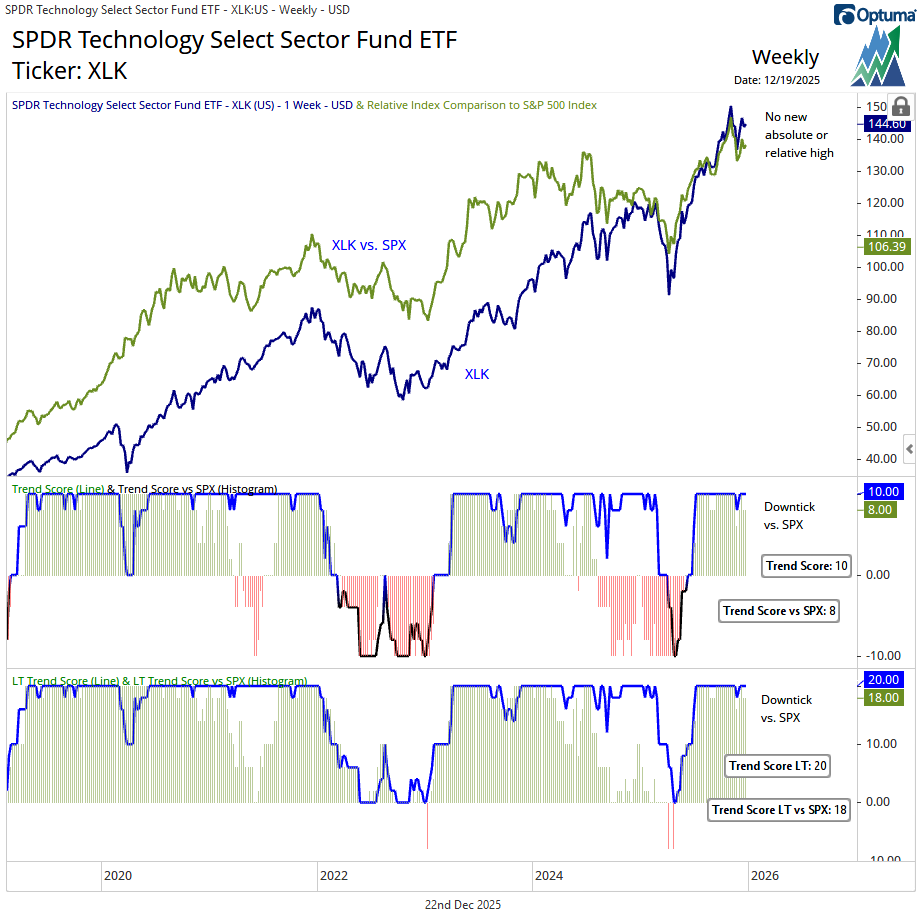 Chart 12: Technology (XLK) and XLK vs. SPX (top), Trend Scores (center), and Long-term Trend Scores (bottom)