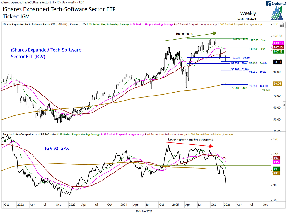 iShares Expanded Tech-Software ETF (IGV) broke down relative to the SPX in late 2025, which provides a bearish leading indicator for absolute price weakness into 2026. While below the 13-, 26-, and 40-week moving averages (WMAs) at 107.13-109.23 and the December lower high at 110.85, the risk is for deeper downside below 98.93-97.33 (61.8% extension, late November low, and 50% retracement) toward 92.46-91.56 (61.8% retracement and 100% extension) and potentially down to 80.26-95.96 (rising 200-WMA, 161.8% extension, and 2025-2024 lows).