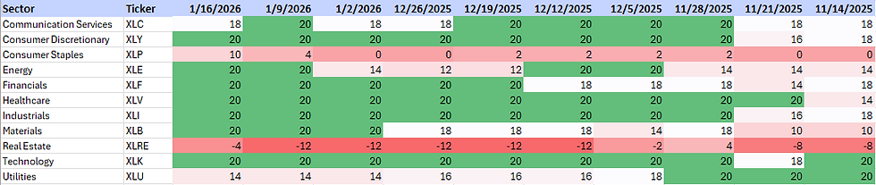 · Improved last four weeks vs. prior four weeks: XLP, XLF, and XLB, but XLE has improved entering 2026