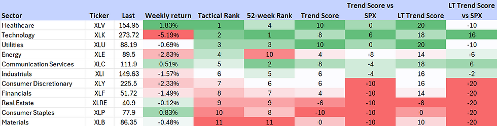 We evaluate the relative strength and momentum of S&P 500 GICS Level 1 sector ETFs using a multi-dimensional ranking approach. This analysis incorporates both short-term and long-term performance metrics to identify sector leadership and underperformance. Key inputs include Tactical Rank, 52-week Rank, Trend Scores, and Long-term Trend Scores. Trend Scores are evaluated on both an absolute price basis and relative to the S&P 500 (SPX) benchmark. Combined, these indicators provide a comprehensive view of each sector’s technical condition and trend durability across multiple timeframes.