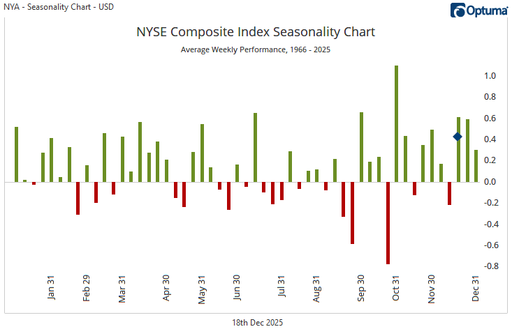 The broad-based NYSE Composite shows positive weekly seasonality from this week into early January using data going back to 1966.